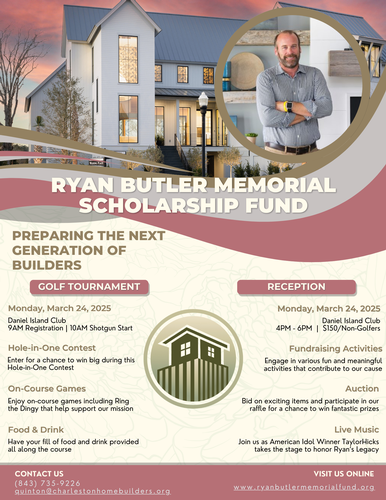 This inaugural golf tournament serves as an opportunity to celebrate the formation of the Ryan Butler Memorial Scholarship Fund. This fund will provide a lasting legacy to Ryan and his family's impact on the Lowcountry through scholarship support for generations to come entering the construction trades.